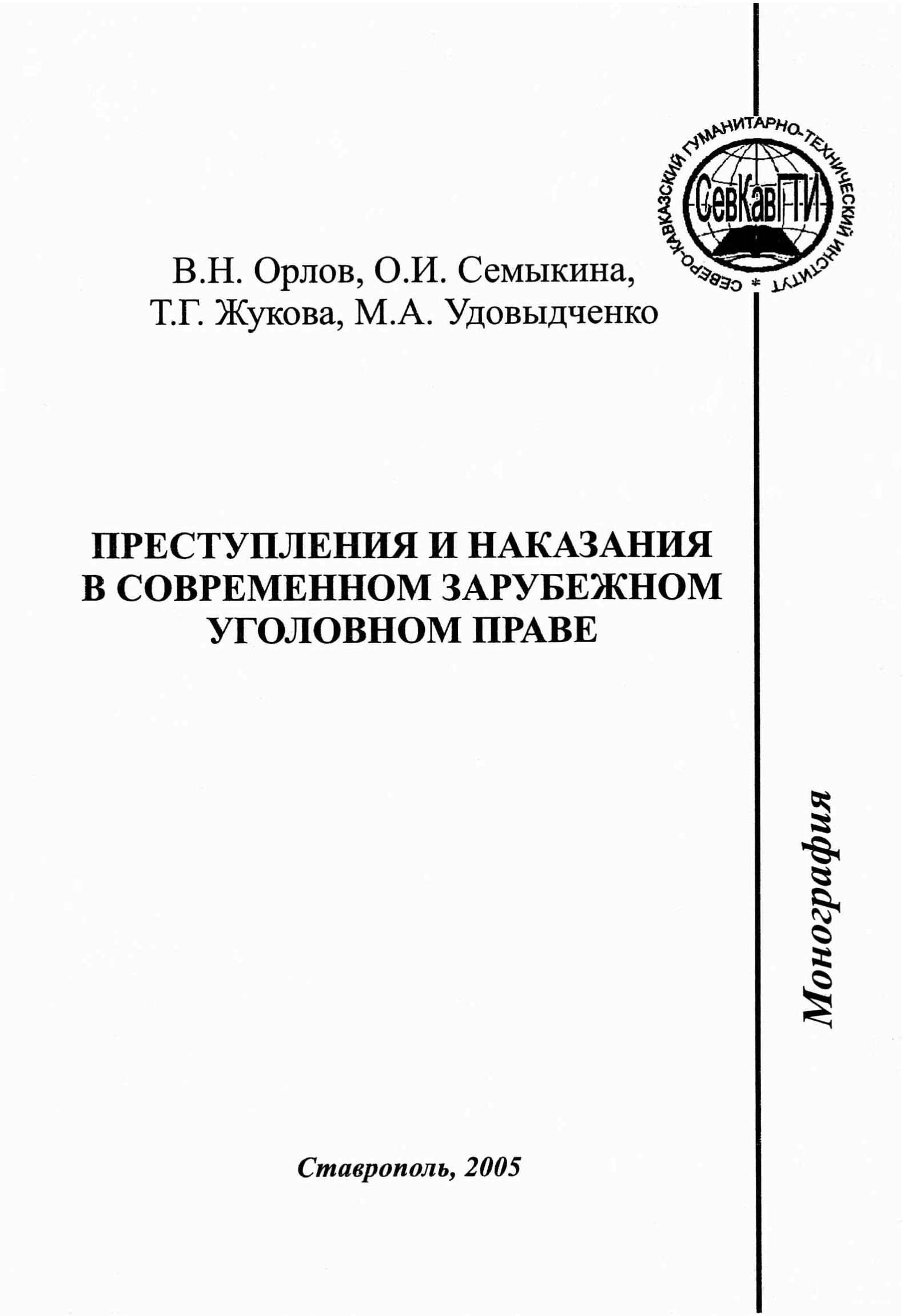 - Орлов В.Н. Преступления и наказания в современном зарубежном уголовном праве: монография / В.Н. Орлов, О.И. Семыкина, Т.Г. Жукова, М.А. Удовыдченко. – Ставрополь: Северо-Кавказский гуманитарно-технический институт, 2005. – 306 с.