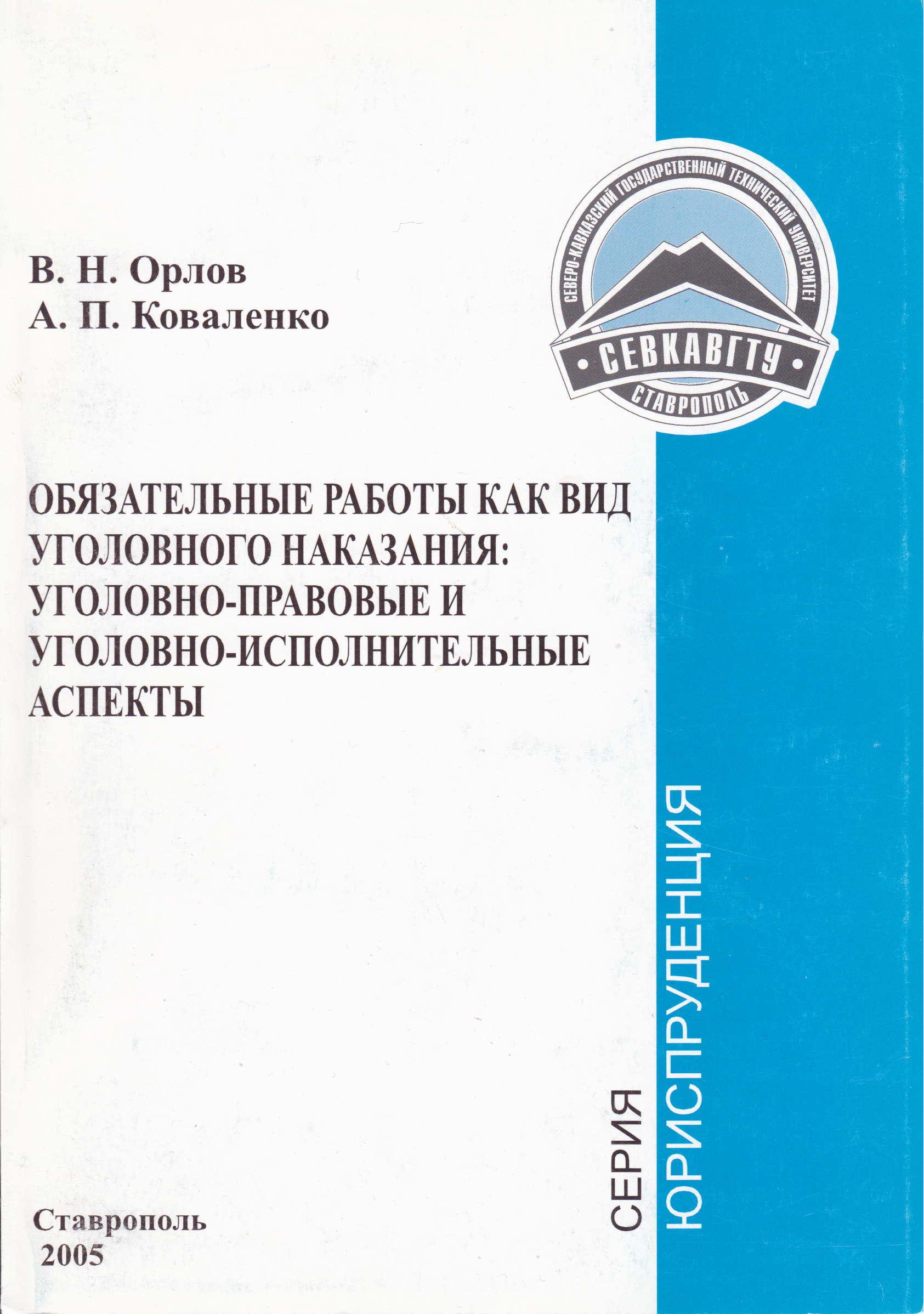 - Орлов В.Н. Обязательные работы как вид уголовного наказания: уголовно-правовые и уголовно-исполнительные аспекты: монография / В.Н. Орлов, А.П. Коваленко. – Ставрополь: Северо-Кавказский государственный технический университет, 2005. – 200 с. (Серия «Юриспруденция»).