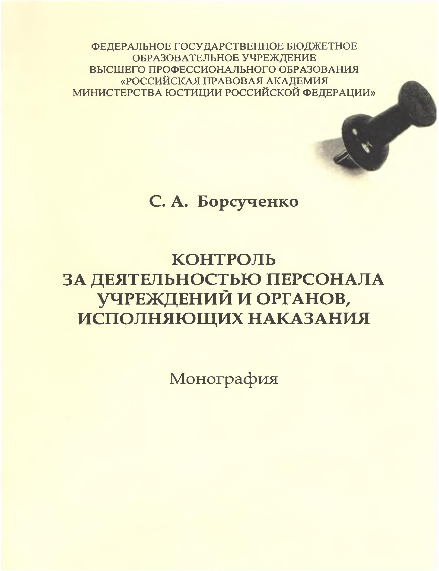 - Борсученко С.А. Контроль за деятельностью персонала учреждений и органов, исполняющих наказания: монография / С.А. Борсученко; РПА Минюста России. – М.: РПА Минюста России, 2013. – 130 с.