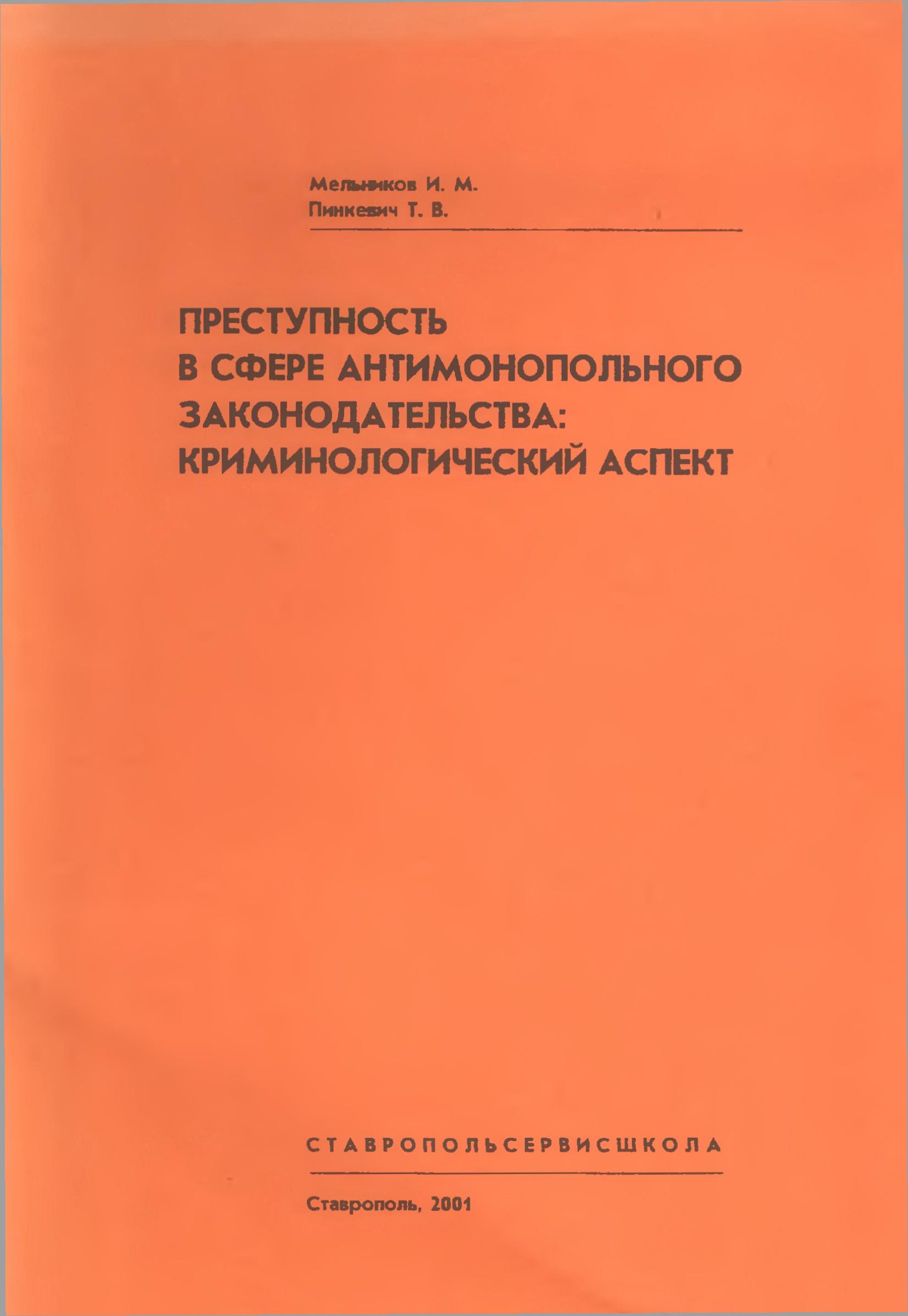 - Мельников И.М., Пинкевич Т.В. Преступность в сфере антимонопольного законодательства: криминологический аспект: монография. – Ставрополь: Ставропольсервисшкола, 2001. – 88 с.