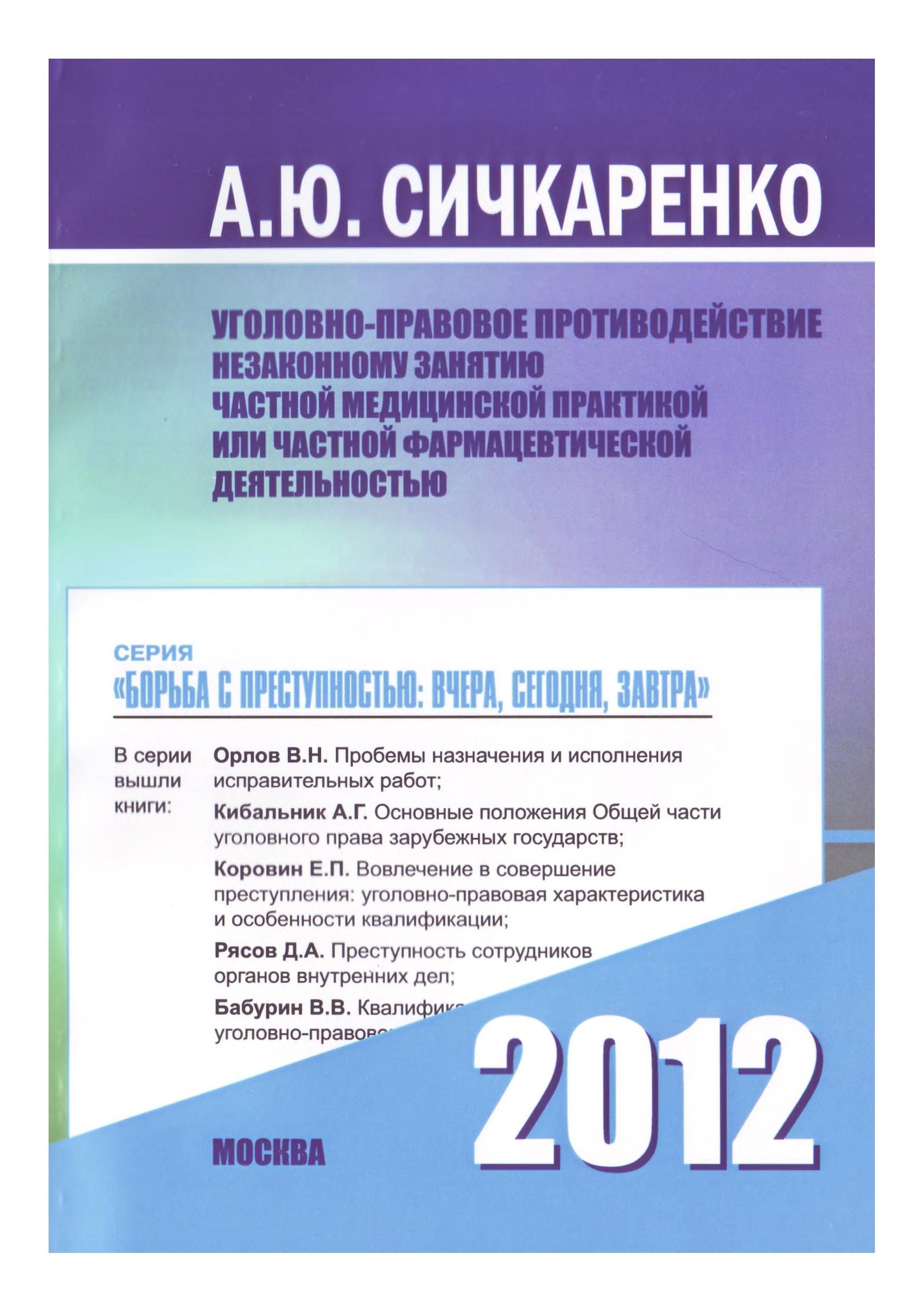 - Сичкаренко, А. Ю. Уголовно-правовое противодействие незаконному занятию частной медицинской практикой или частной фармацевтической деятельностью: монография / А. Ю. Сичкаренко; под общ. науч. руководством проф. А.Г. Кибальника. – М.: Илекса, 2012. – 184 с. – (Серия: «Борьба с преступностью: вчера, сегодня, завтра»).