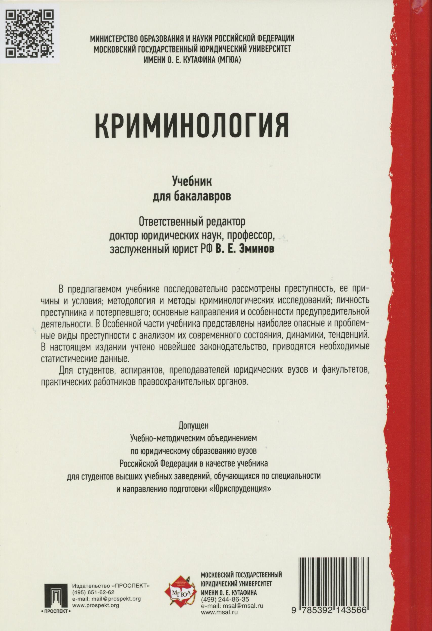 Опубликовано первое издание учебника по криминологии под редакцией В.Е. Эминова, подготовленное преподавателями кафедры криминологии и уголовно-исполнительного права Московского государственного юридического университета имени О.Е. Кутафина (МГЮА): Криминология: учебник / отв. ред. В. Е. Эминов. – Москва: Проспект, 2015. – 368 с.